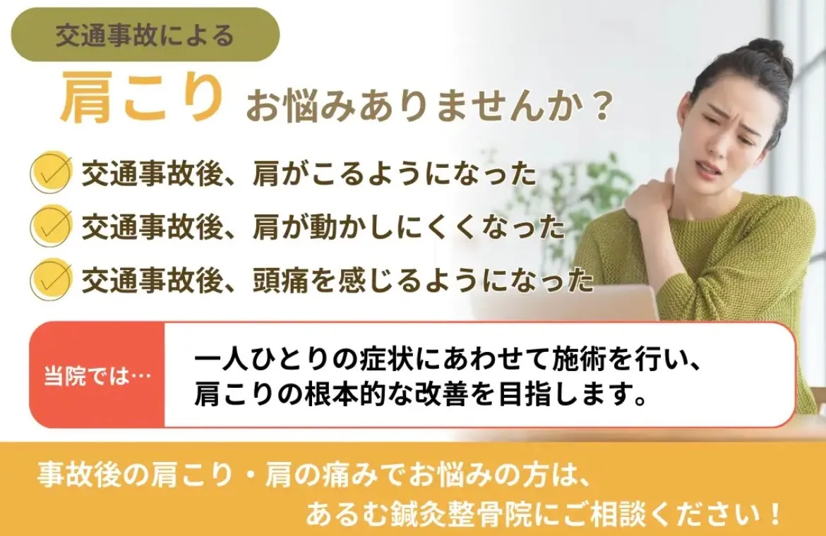 このような症状は、**交通事故によるむち打ちや筋緊張の影響による“肩こり・首こり”**の可能性があります。