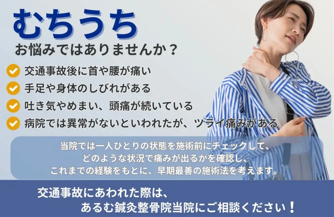 交通事故後のむちうち治療なら|都城市・三股町のあるむ鍼灸整骨院【自賠責保険対応・後遺症リスク回避】 【事故後の首・腰の痛み…放置していませんか?】交通事故の数日後から首や腰が痛む頭痛・めまい・吐き気が続いている手足のしびれや全身のだるさが治らない病院で「異常なし」と言われたが、つらい不調が…